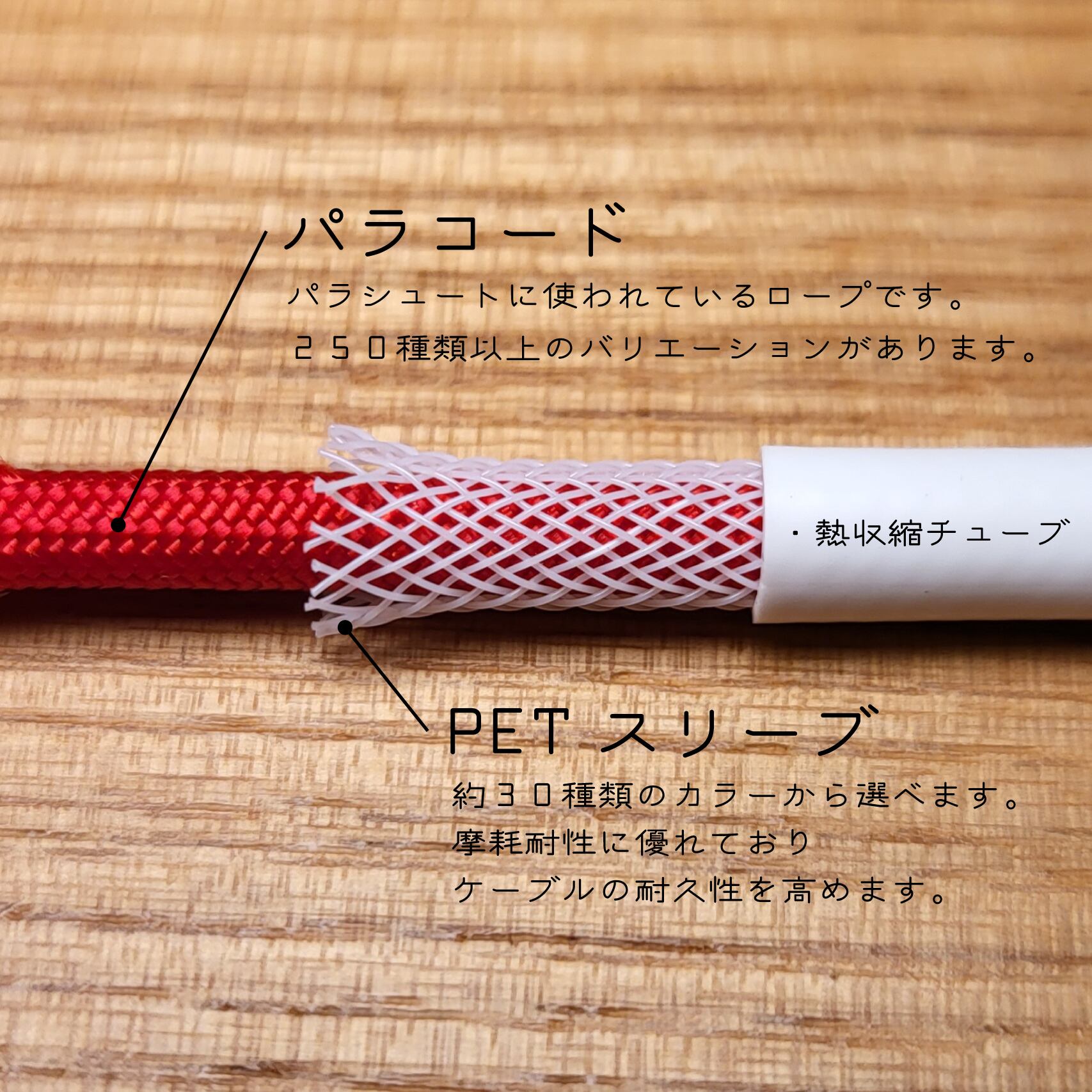 パラコード、PETスリーブ、熱収縮チューブを好きなカラーで構成しコネクターを選んで注文して下さい。